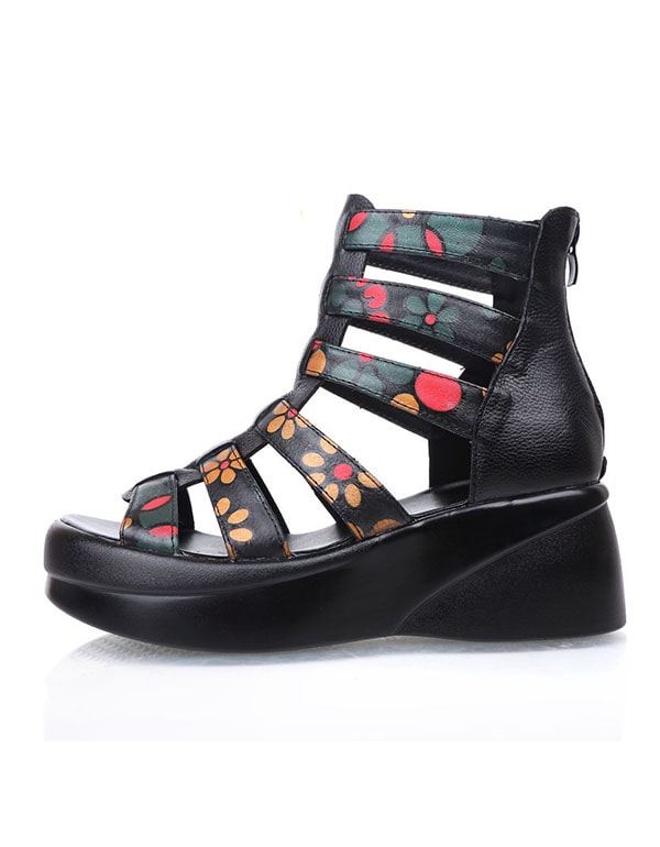 Letnie Sandały Na Koturnie Z Nadrukiem Ze Skóry