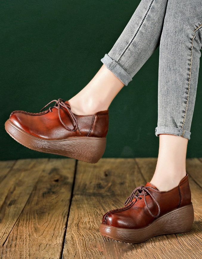 Prawdziwa Skóra Klinowa Okrągła Główka Sznurowane Buty Sprężynowe
